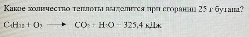 Какое количество теплоты выделится при сгорании 25 г бутана C4H10+ O2 + CO2+H2O + 325,4 кДж СРОЧНО