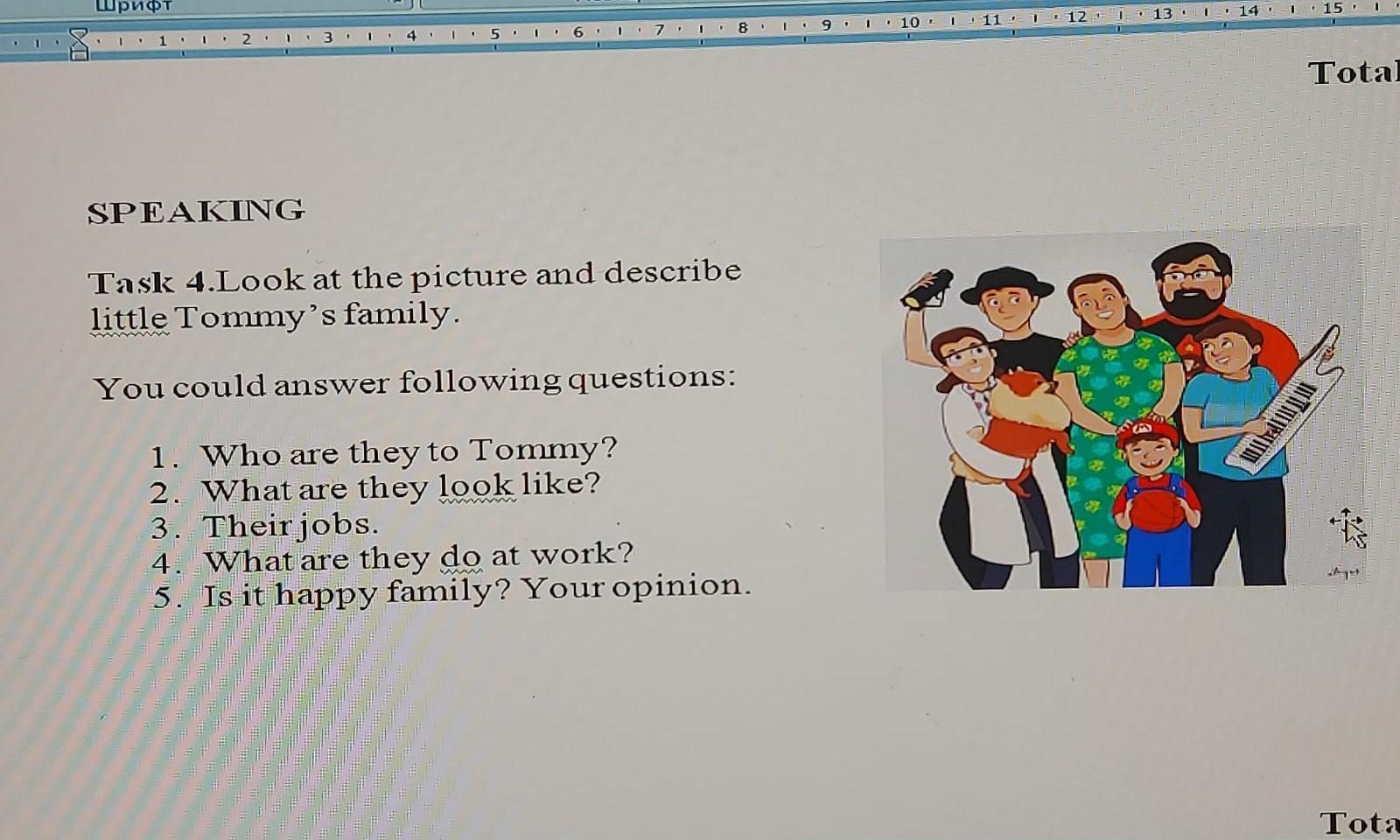 SPEAKING Task 4.Look at the picture and describe little Tommy's family. You could answer following questions: 1. Who are they to Tommy? 2. What are they look like? 3. Their jobs. 4. What are they do at work? www 5. Is it happy family? Your opinion. ANTONI DE MIN *