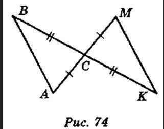 3. Доведіть рівність трикутників ABC і МКС (рис. 74)