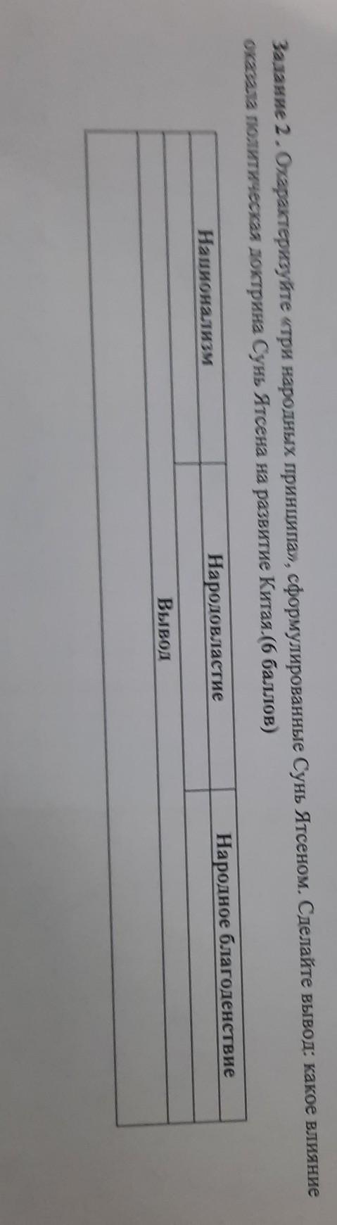 Задание 2. Охарактеризуйте «три народных принципа», сформулированные Сунь Ятсеном. Сделайте вывод: какое влияние казала политическая доктрина Сунь Ятсена на развитие Китая.(6 баллов) Народовластие Вывод Национализм Hapoднoe благоденствие