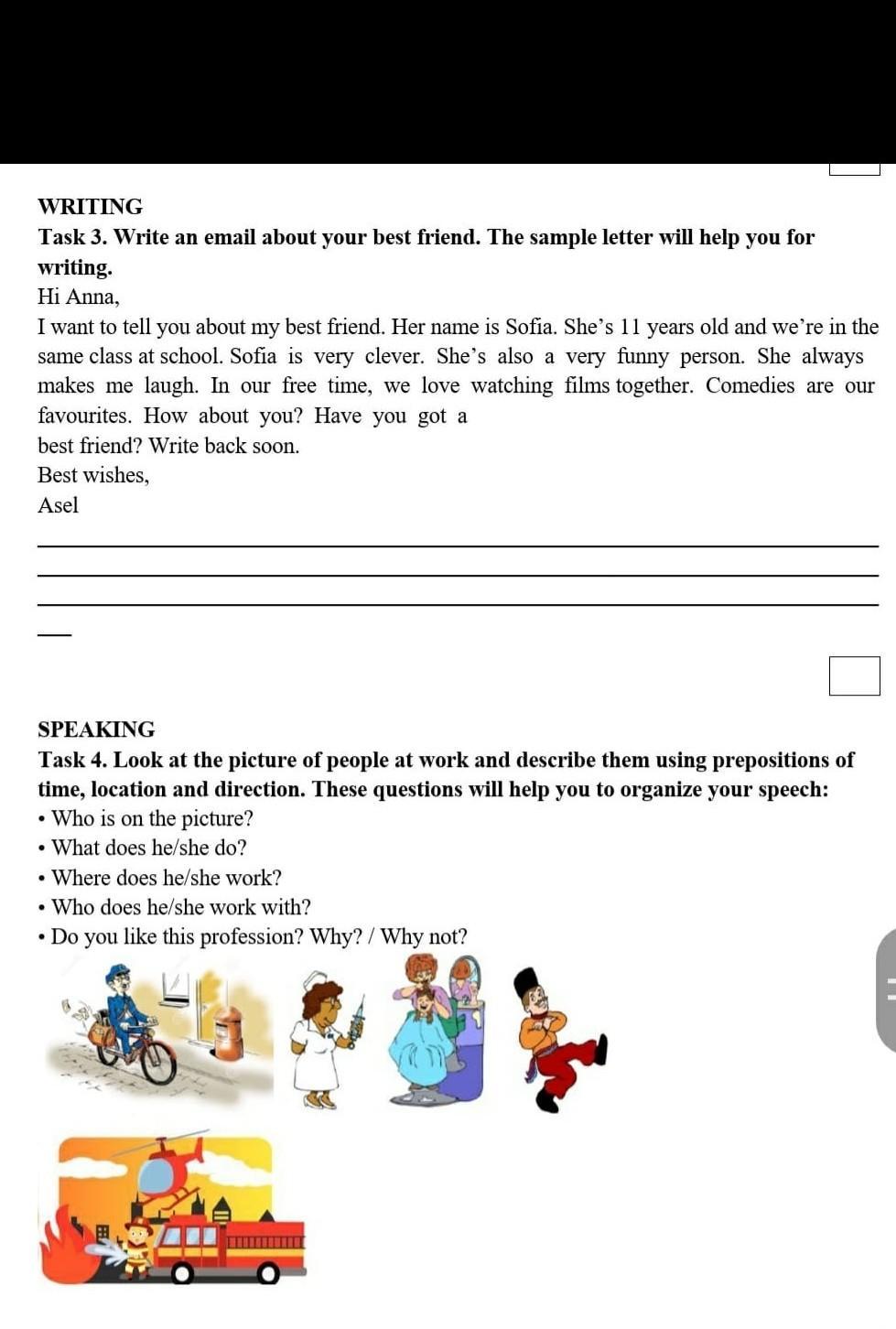 WRITING Task 3. Write an email about your best friend. The sample letter will help you for writing. Hi Anna, I want to tell you about my best friend. Her name is Sofia. She's 11 years old and we're in the same class at school. Sofia is very clever. She's also a very funny person. She always makes me laugh. In our free time, we love watching films together. Comedies are our favourites. How about you? Have you got a best friend? Write back soon. Best wishes, Asel SPEAKING Task 4. Look at the picture of people at work and describe them using prepositions of time, location and direction. These questions will help you to organize your speech: Who is on the picture? What does he/she do? Where does he/she work? ● . . Who does he/she work with? ● Do you like this profession? Why? / Why not? ●