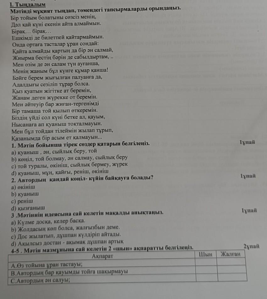 I. Тындалым Мәтiндi мұқият тындап, төмендегі тапсырмаларды орындаңыз. Бiр тойым болатыны сөзсiз менiн, Дәл кай күнi екенін айта алмаймын. Бiрак... бiрак... Ешкiмдi де билетпей кайтармаймын. Онда ортаға тасталар уран сондай: Кайта алмайды картын да бір ән салмай, Жиырма бестiң бәрiн де сабылдыртам, .. Мен өзiм де ән салам түн ауғанша, Менiн жаным бұл кунге құмар канша! Бәйге берем жыгылган палуанга да, Адалдығы сезiлiп турар болса. Қыз куатын жігітке ат беремін, Жанам деген жүрекке от беремін. Мен әйтеуiр бар жиған-тергенімді Бір тамаша той кылып өткеремін. Бiздiн үйдi сол кунi бетке ал, кауым, Нысанага ап куаныш тоқталмауын. Мен бұл тойдан тiлеймiн жылап тұрып, Казанымда бір асым ет калмауын... 1. Мәтін бойынша тiрек сөздер катарын белгiленiз. a) куаныш, ән, сыйлык беру, той b) кенiл, той болмау, ән салмау, сыйлык беру с) той туралы, екiнiш, сыйлык бермеу, жүрек d) куаныш, мун, кайгы, реніш, өкініш 2. Автордын кандай конiл-күйін байқауға болады? а) өкiнiш b) куаныш c) реніш d) кызганыш 3 .Метiн нiн идеясына сай келетiн макалды анықтаңыз. а) Кулме доска, келер баска. b) Жолдасын көп болса, жалгызбын деме, c) Дос жылатып, душпан кулдiрiп айтады. d) Акылсыз достан - акымак душпан артык 4-5. Мәтін мазмұнына сай келетін 2 «шын» ақпаратты белгіленіз. Акпарат А.Өз тойына уран тастауы; В.Автордың бар кауымды тойға шақырмауы С.Автордың ән салуы; Шын Жалған 1ұпай Тупай 1 пай 2 пай