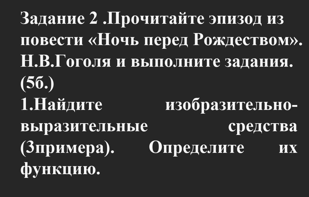 Объяснение: Ну смотри тебе прочитать эпизод из Гоголя " Ночь перед Рождеством". И выполнить задание. Когда прочитаешь текст найдёшь изобразитильно - выразительные средства. Ну это выразительные средства это можно понять как: эпитеты, сравнение, метафоры гиперболы и олицетворение. Например: Эпитеты - это прилагательные. Кот средний, а мышка маленькая. Сравнение - это когда с чем - то сравниваешь. Змея длинная, и похожа на длинную верёвку. Ну и т.д. остальное найдёшь в интернете надеюсь помогла) С хорошими тебе оценками с 5!)