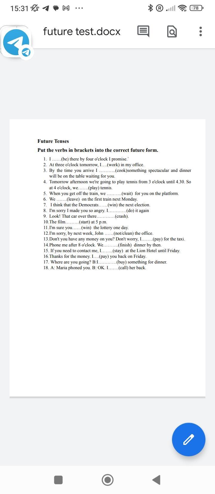 2. At three o'clock tomorrow, I will work in my office.