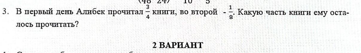 В первый день Алибек прочитал ¾ книги, во второй-⅛.Какую часть книги ему осталось прочитать?