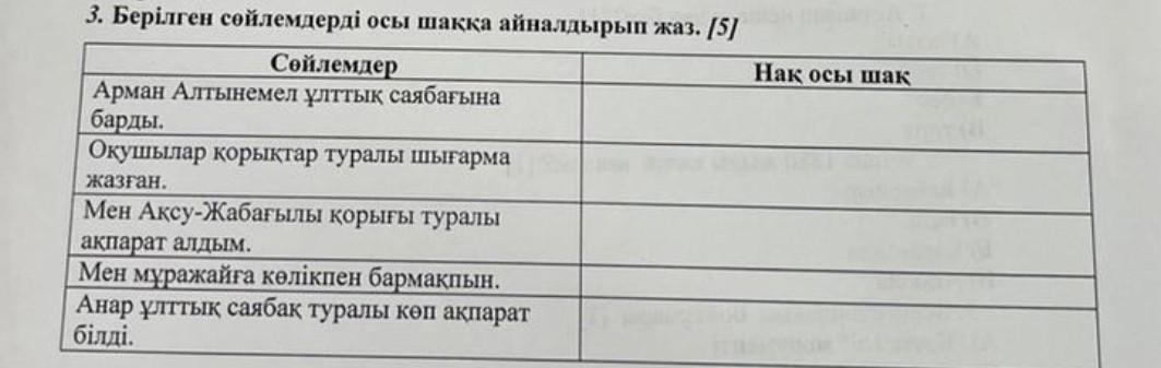 3. Берілген сөйлемдерді осы шаққа айналдырып жаз. [5] Нак осы шақ Сөйлемдер Арман Алтынемел ұлттык саябағына барды. Оқушылар қорықтар туралы шығарма жазган. Мен Ақсу-Жабағылы қорығы туралы акпарат алдым. | Мен мұражайға көлікпен бармақпын. Анар ұлттық саябак туралы көп ақпарат бiлдi. даю 100б