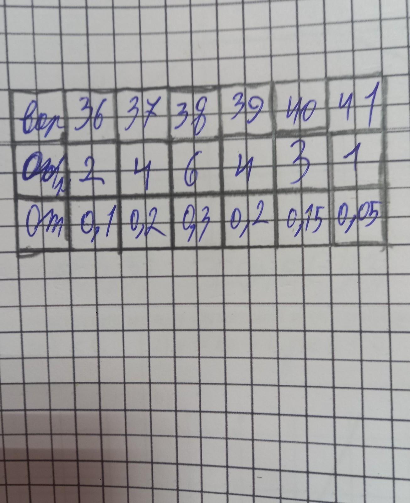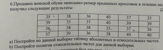6.Продавец женской обуви записывал размер проданных кроссовок в течение не получил следующие результаты: 38 35 38 39. 35 - 37 35 39 39 39 36 37 36 37 40 40 36 37 38 36 40 40 35. 38 а) Постройте по данной выборке таблицу абсолютных и относительных частот. b) Постройте полигон относительных частот для данной выборки.