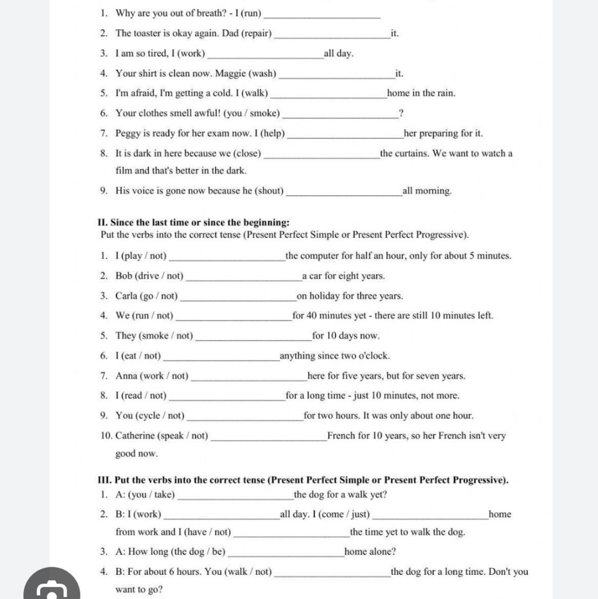 III. Put the verbs into the correct tense (Present Perfect Simple or Present Perfect Progressive).