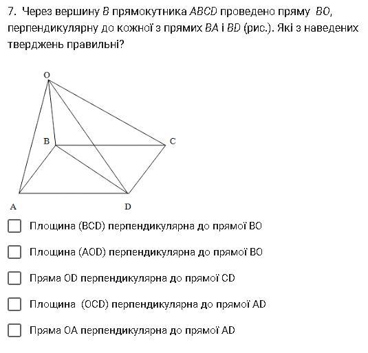 73 БАЛЛА! Через вершину В прямокутника ABCD проведено пряму ВО, перпендикулярну до кожної з прямих ВА і ВD (рис.). Які з наведених тверджень правильні?