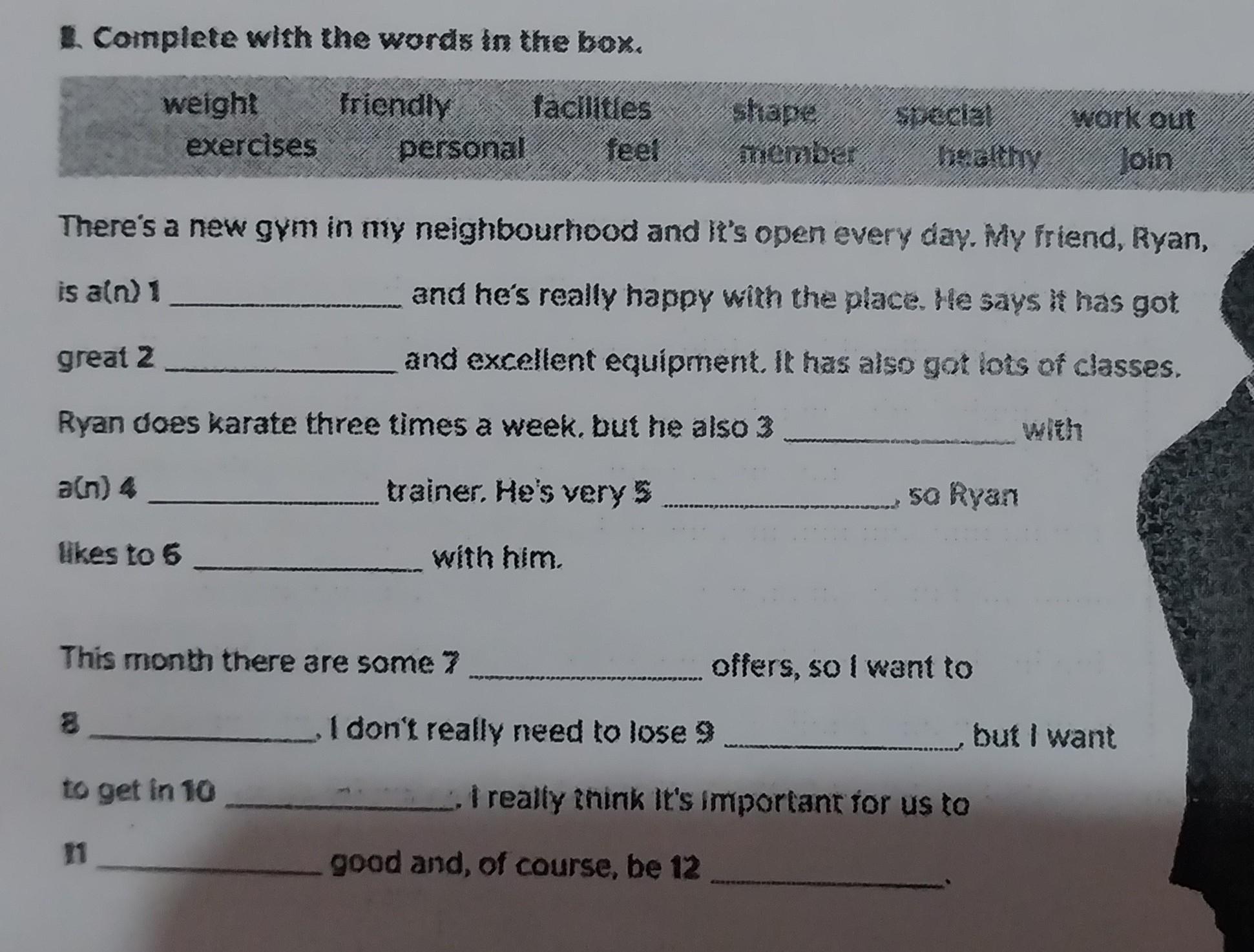 B. Complete with the words in the box. friendly facilities feel weight likes to 6 exercises 8 great 2 Ryan does karate three times a week, but he also 3 a(n) 4 trainer. He's very 5 with him. personal This month there are some 7 11 There's a new gym in my neighbourhood and it's open every day. My friend, Ryan, is a(n) 1 and he's really happy with the place. He says it has got and excellent equipment. It has also got lots of classes. with to get in 10 shape member I don't really need to lose 9 Special good and, of course, be 12 healthy so Ryan offers, so I want to I really think it's important for us to work out Join but I want