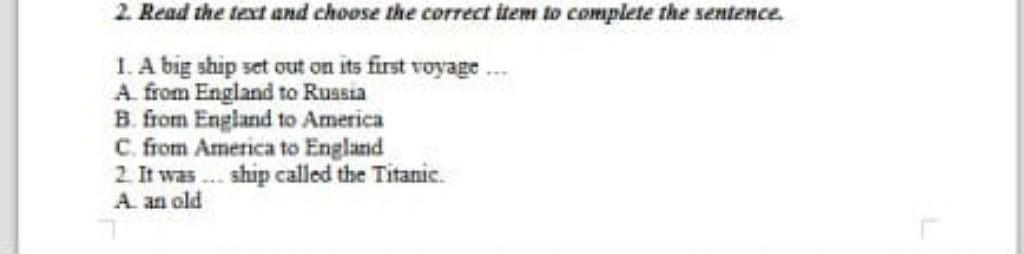1. A big ship set out on its first voyage **from England to America**.