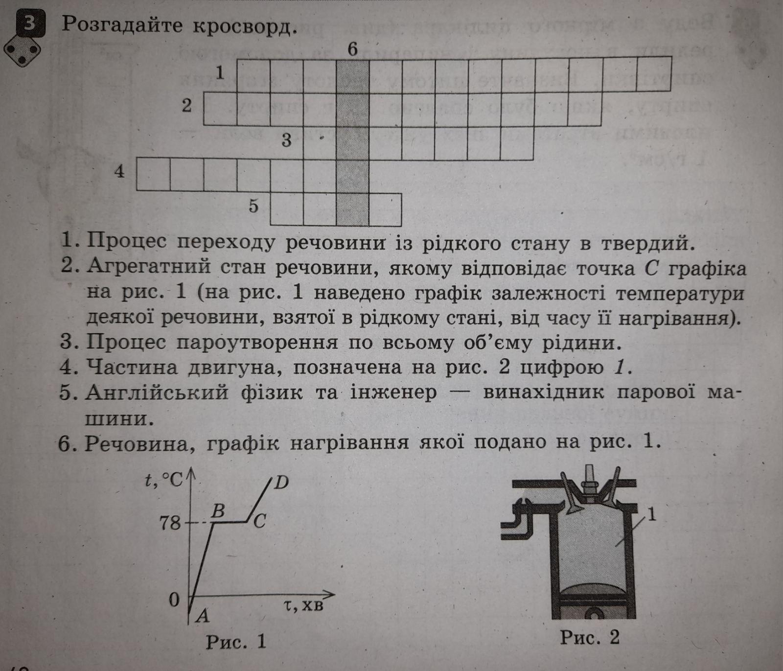 5. 1. Кристалізація 2. Газоподібний 3. Кипіння 4. Циліндр 5. Уатт 6. Спирт