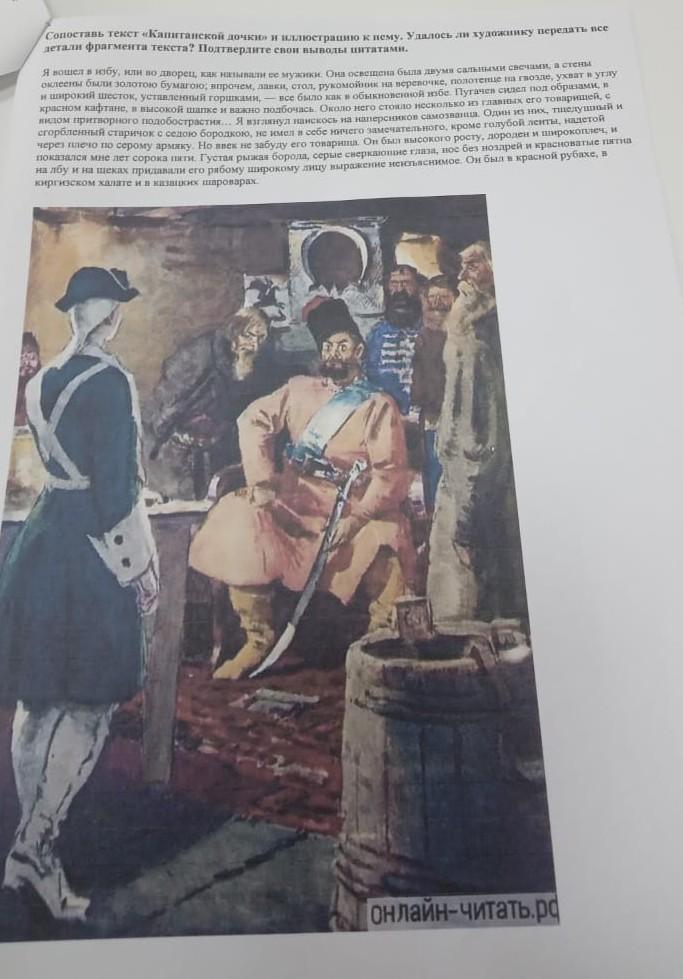 "Пугачев сидел под образами, в красном кафтане, в высокой шапке и важно подбочась."