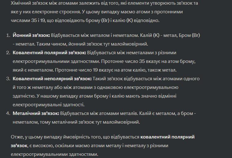 Мiж атомами хiмiчних елементів з протонними числами 35 і 19 хiмiчний зв'язок