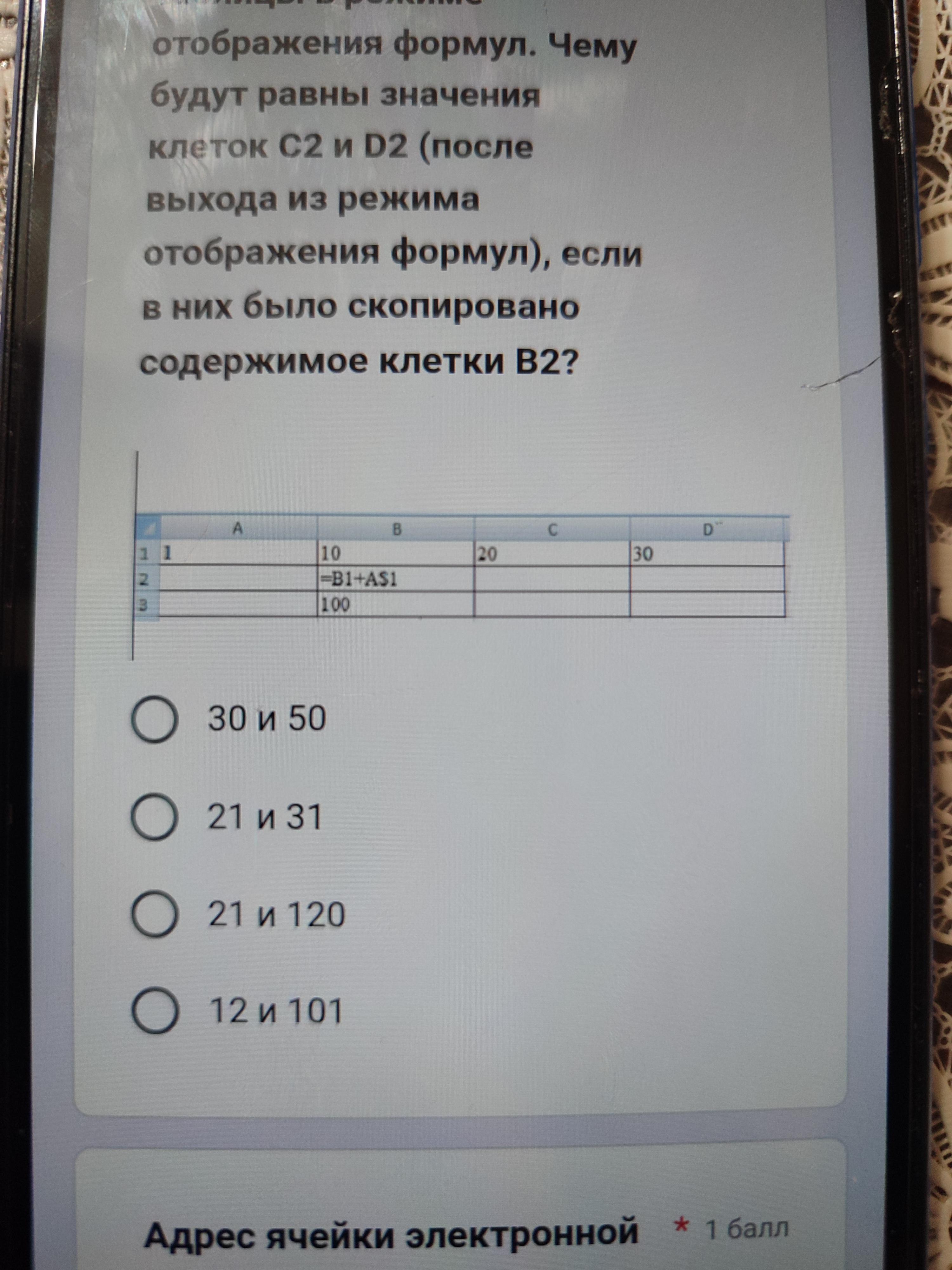 Дан фрагмент электронной таблицы в режиме отображения формул. Чему будут равны значения клеток C2 и D2 (после выхода из режима отображения формул), если в них было скопировано содержимое клетки B2?