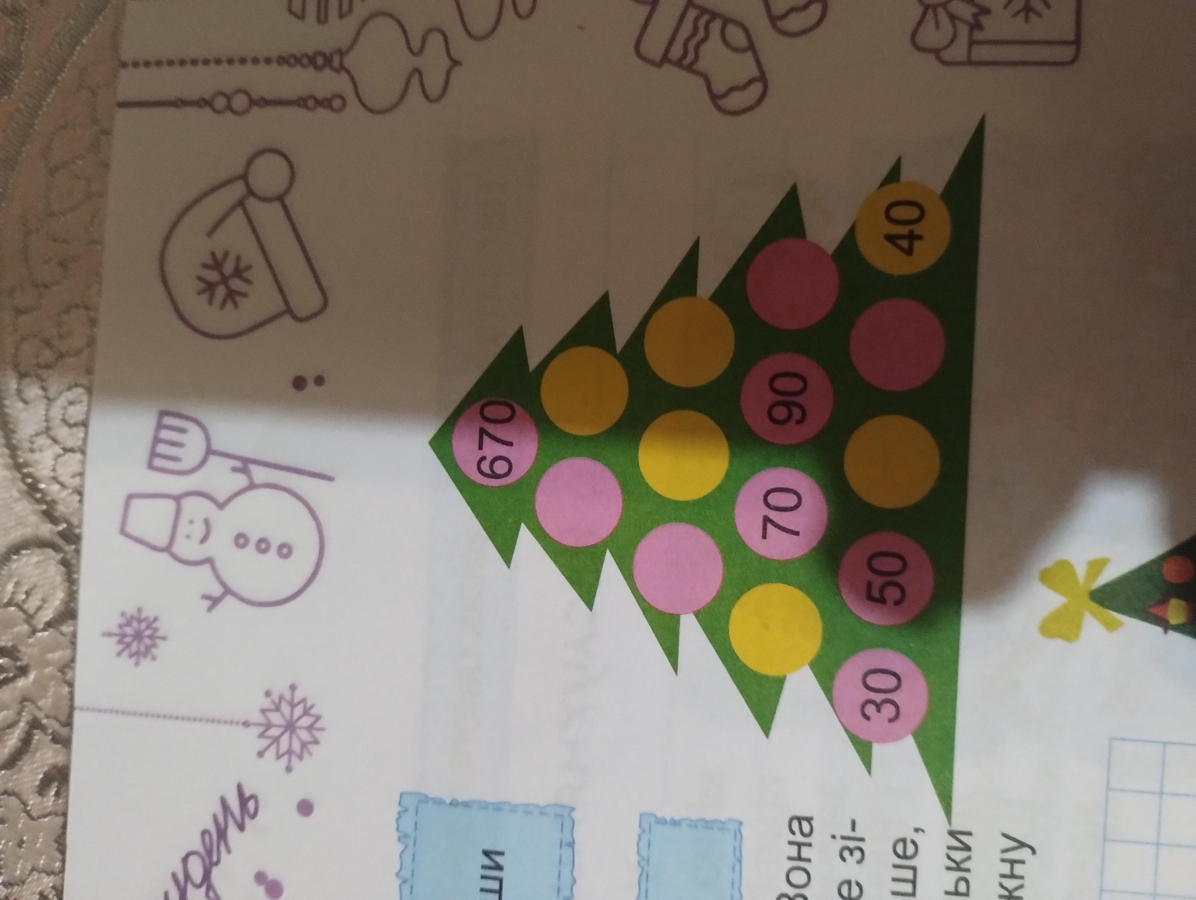 Допоможіть прикрасити ялинку.Установіть закономірність і запишіть на кульках числа яких бракує?!
