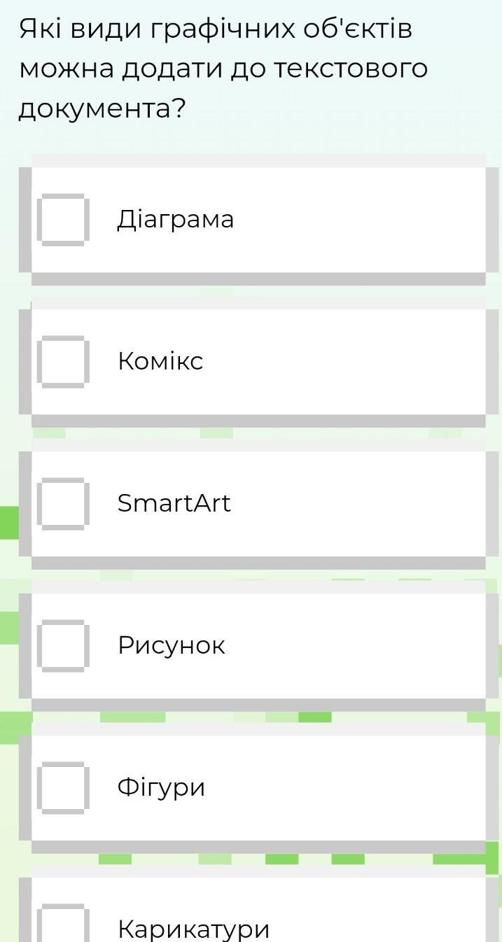 Пояснення: До першого запитання. Комікс та карикатури не графічні об'єкти тому його вставити до текстового документу не можна.