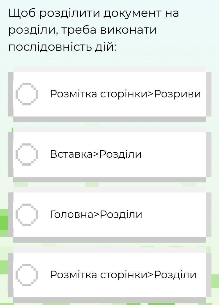 Відповідь: До третього запитання. Розмітка сторінки розрив.