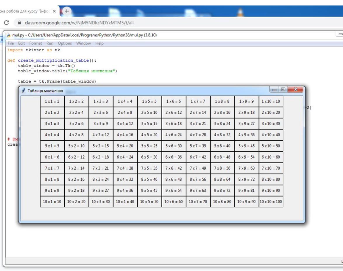 Написати програму, яка розраховує таблицю множення, і виводить її до вікна tkinter