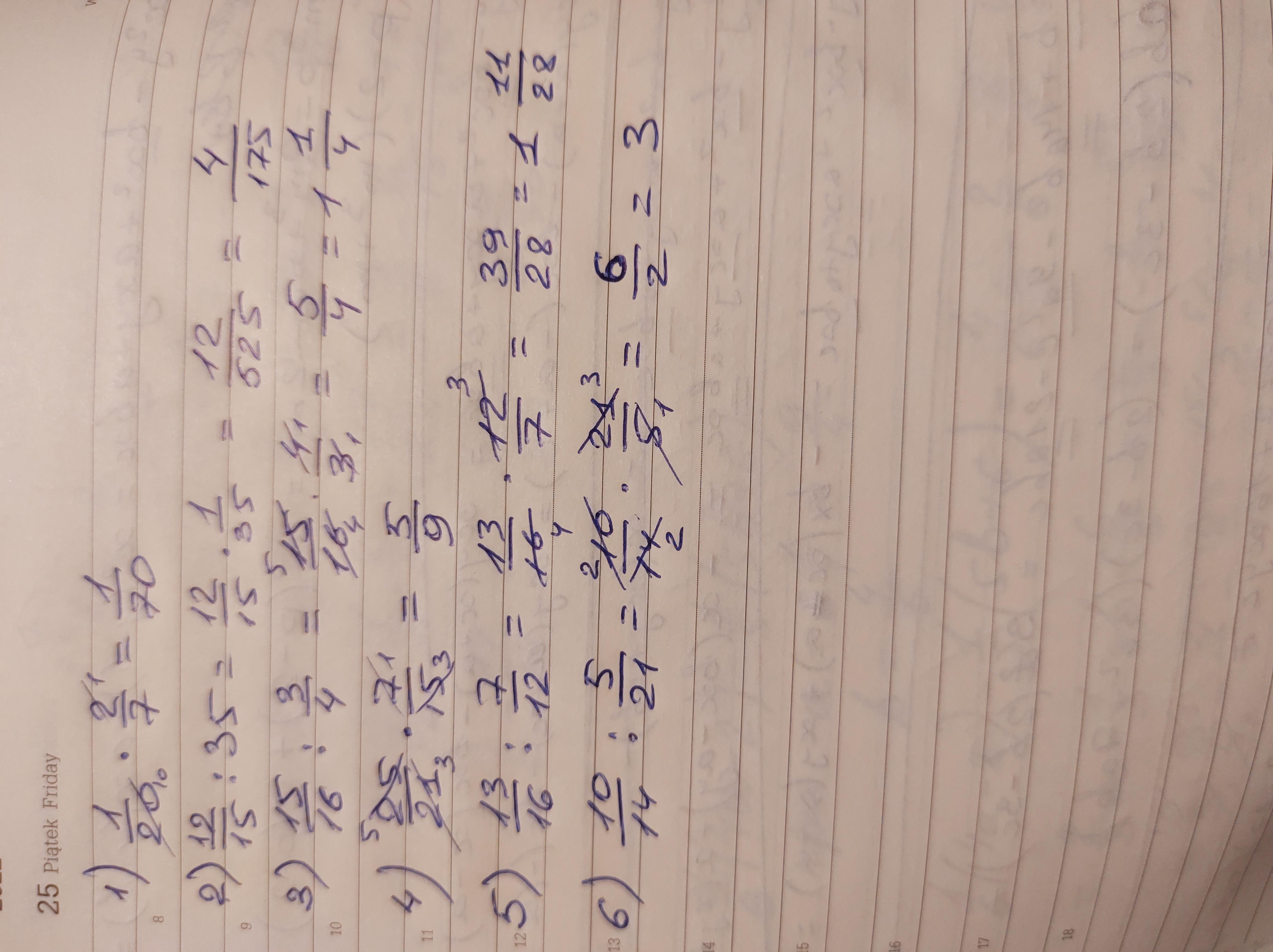 1) 1/20*2/7 2)12/15:35 3) 15/16:3/4 4)25/21*7/15 5)13/16:7/12 6)10/14:5/21