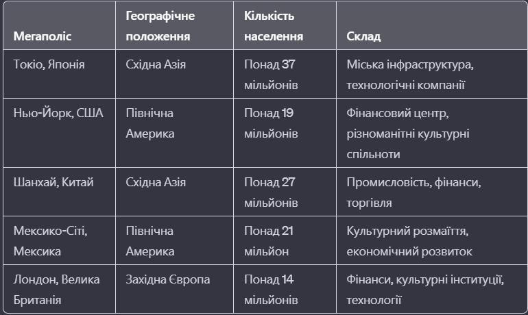 характеристика мегаполісів світу назва, географічне положення, кількість населення, склад