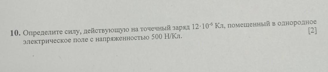 [2] 10. Определите силу, действующую на точечный заряд 12-10-6 кл, помещенный в однородное электрическое поле с напряженностью 500 Н/Кл.