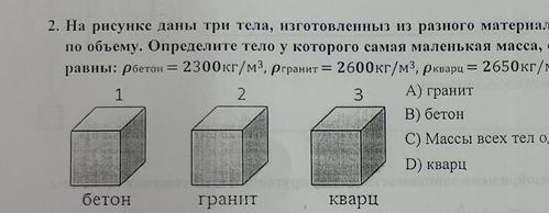 2. На рисунке даны три тела, изготовленныз из разного материала, по объему. Определите тело у которого самая маленькая масса, ec равны: рбетон = 2300кг/м3, Pгранит = 2600кг/м3, ркварц = 2650кг/м3 1 2 3 бетон гранит кварц А) гранит В) бетон С) Массы всех тел оди D) кварц