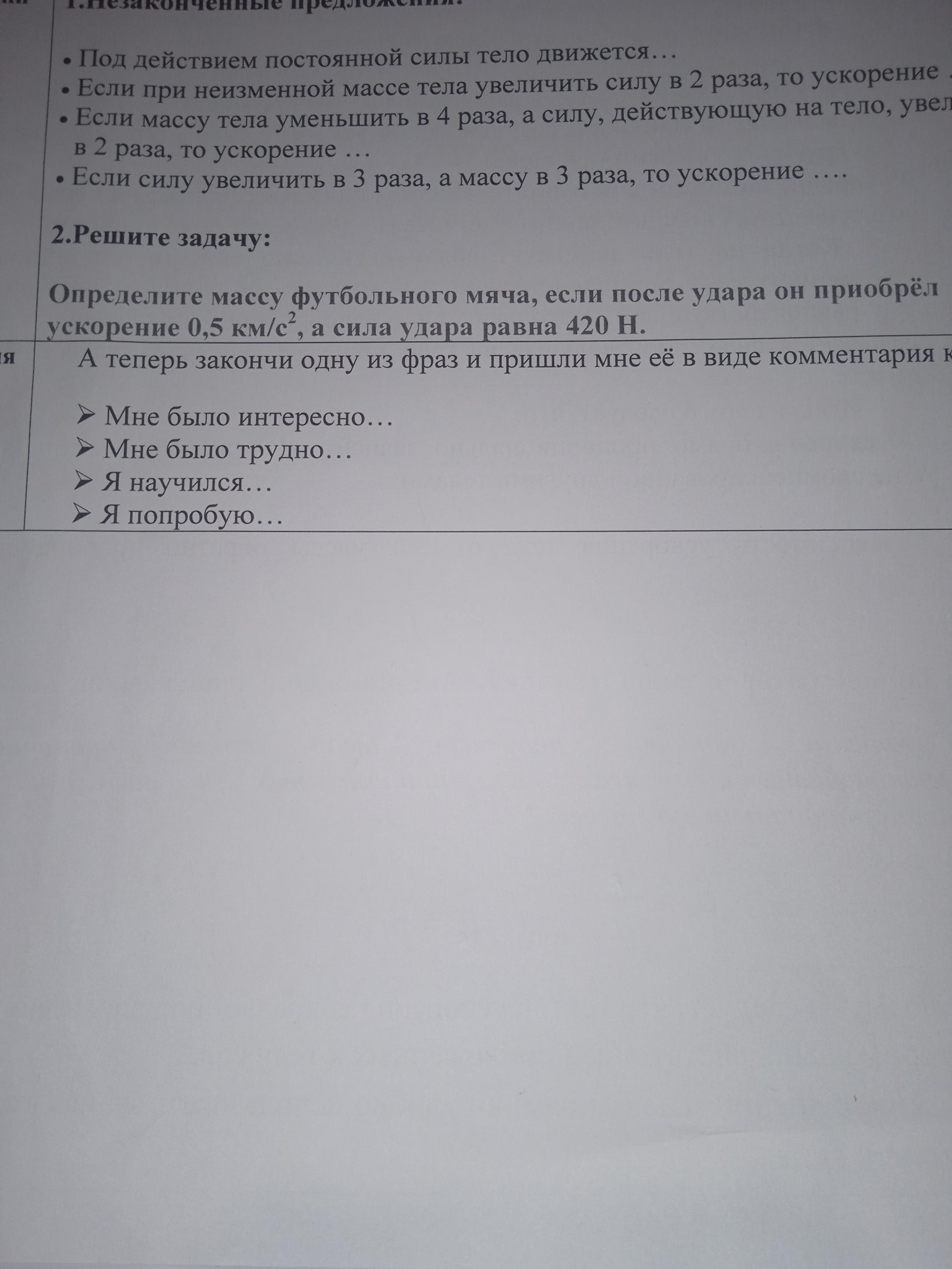 Определите Массу футбольного мяча, если после удара он приобрёл ускорение 0,5 км/с², а сила удара равна 420 Н.