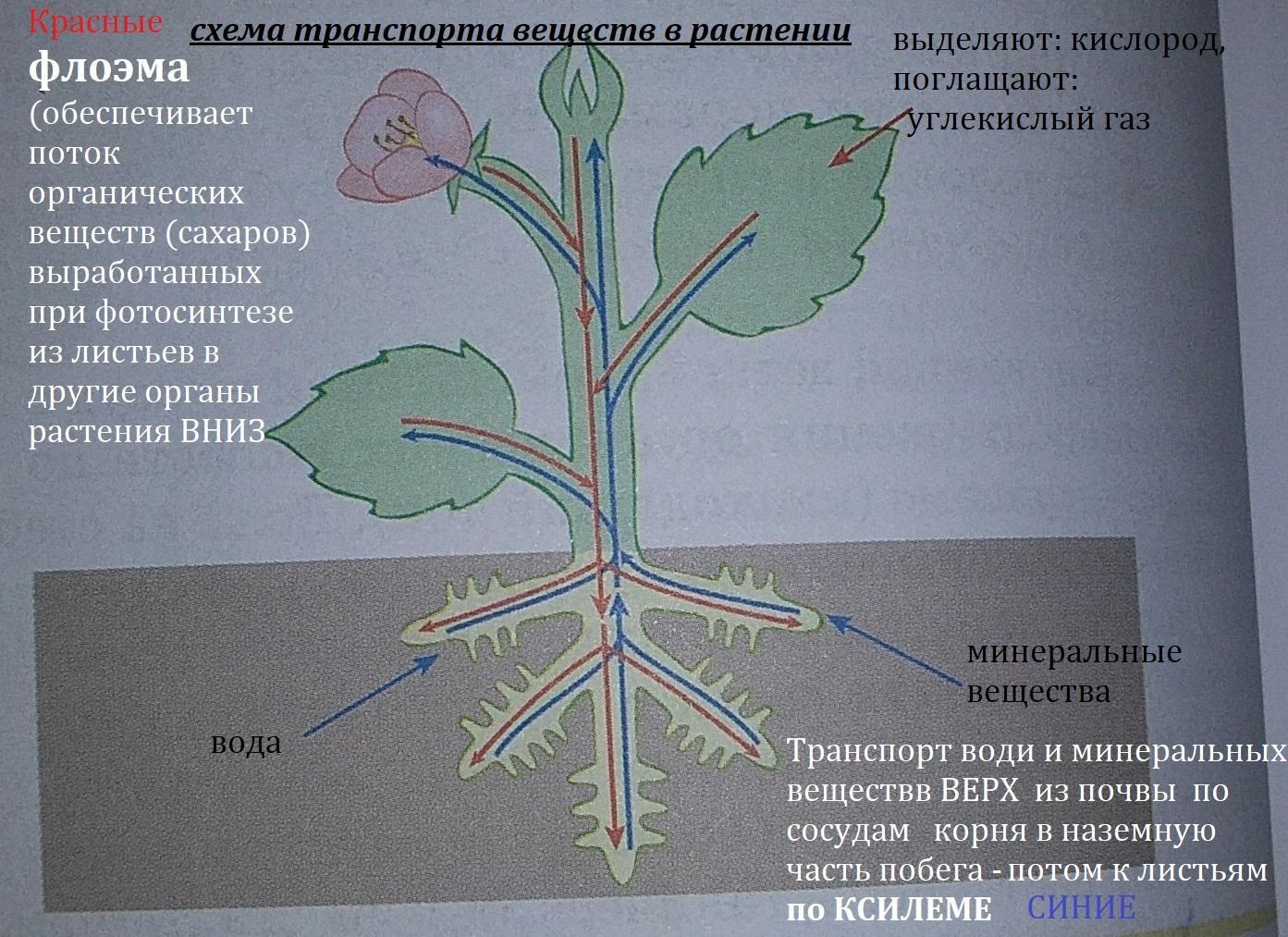 По ксилеме (из корня в стебель) идёт восходящий ток воды с растворёнными в ней минеральными солями. По флоэме — более слабый и медленный ток воды и органических веществ