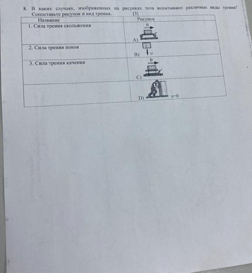 8. В каких случаях, изображенных на рисунках тела испытывают различные виды трения?