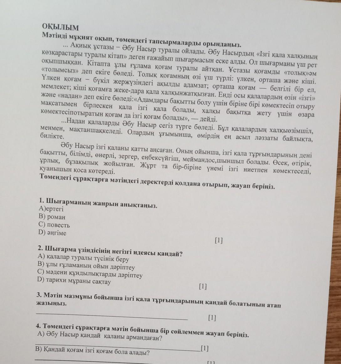 1. D) 2. C) 3. (Можно напишу на русском,на казахском не шарю) Жители города должны доверять и сотрудничать с друг-другом,они не должны ругаться,драться,должны быть доверчивыми друг к другу. И должны желеть друг друга. 4.A) Абу Насир(или как там)хотел что бы жители города были добры друг к другу B)хорошое общество-это когда в обществе гармония