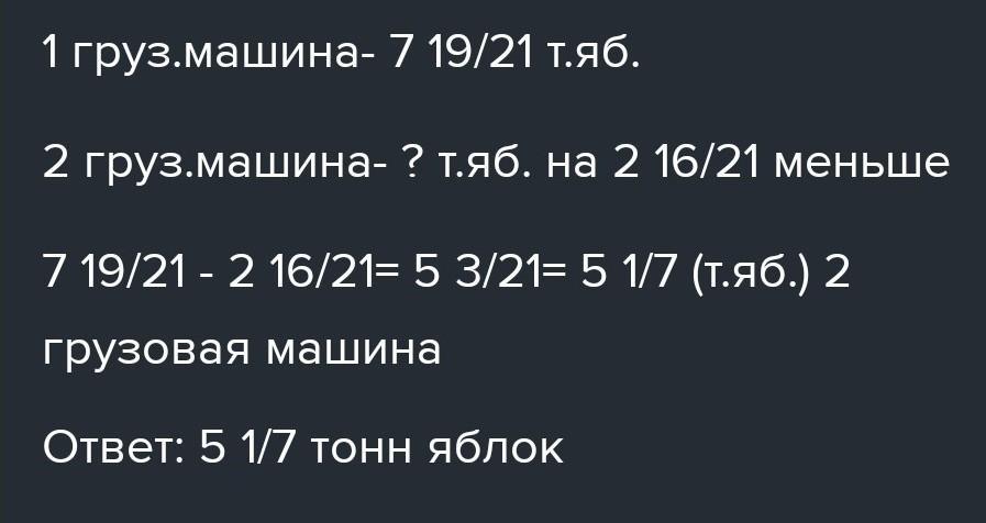 1. 14 Яблоки на склад доставили на двух грузовых машинах. В первой грузовой машине было 6 15 2 яблок, во второй грузовой машине - на 3- т меньше, чем в первой. Сколько тонн яблок 15 доставила вторая грузовая машина? Ответ запиши в виде смешанного числа с несократимой дробной частью.