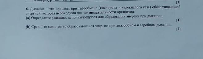 6. Дыхание - это процесс, при газообмене (кислорода и углекислого газа) обеспечивающий энергией, которая необходима для жизнедеятельности организма. (а) Определите реакцию, использующуюся для образования энергии при дыхании. (b) Сравните количество образовавшейся энергии при анаэробном и аэробном дыхании. [1] [2]