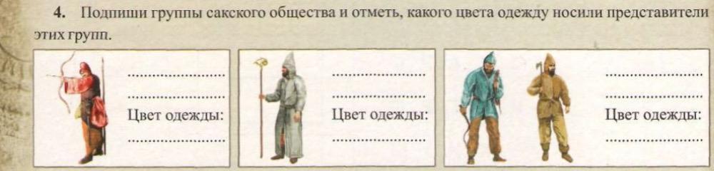 Сакские воины носили одежду красного и желтого-красного цветов, жрецы одевали одежду белого цвета, а скотоводы и земледельцы носили одежду желтого или синего цветов. В древних письменных источниках говорится высоком и почетном положении женщин в сакском обществе.