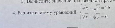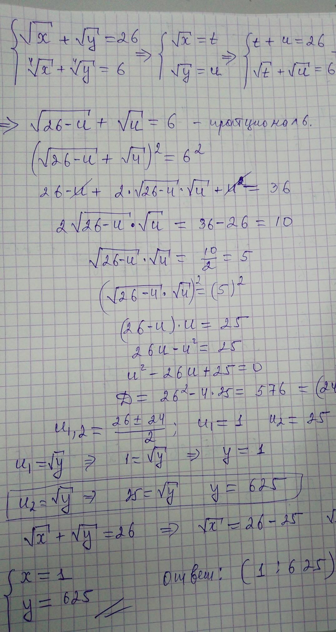 ответ х=1 и у=625 то есть корен х равно 1 и корен у=25