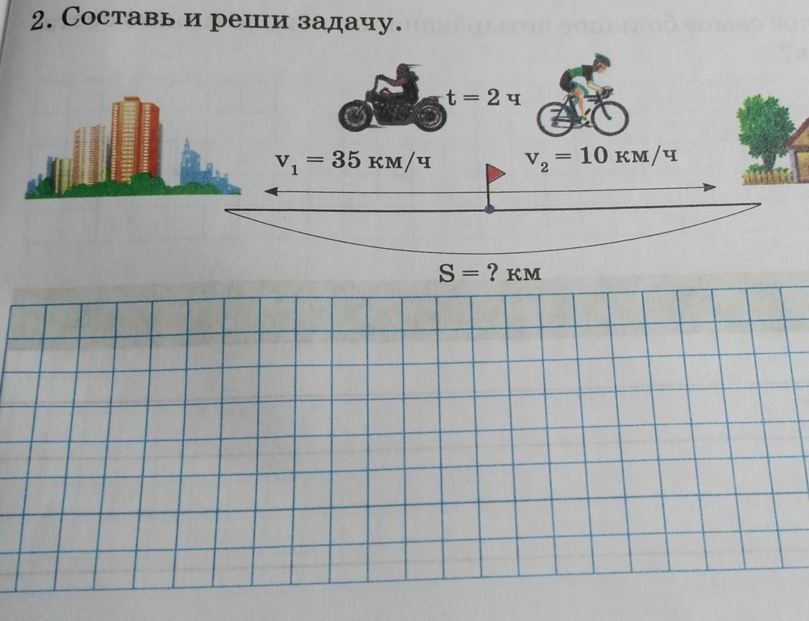 2. Составь и реши задачу. V1 35 км/ч = t=2 ч v2 = 10 км/ч S = ? км