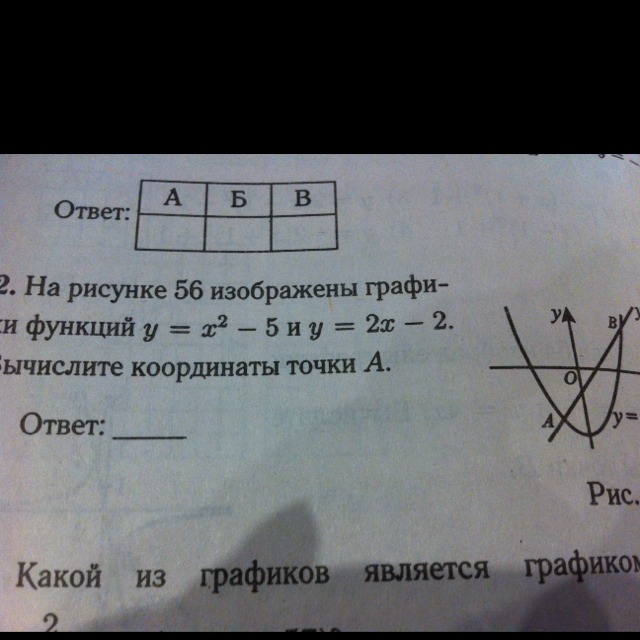 приравниваешь правые части,т.е. x^2-5=2x-2,переносишь все в одну сторону и решаешь как обычное квадратное уравнение,х-должен быть отрицательным,когда найдешь х,находишь у,а для этого подставляешь в любое уравнение и все