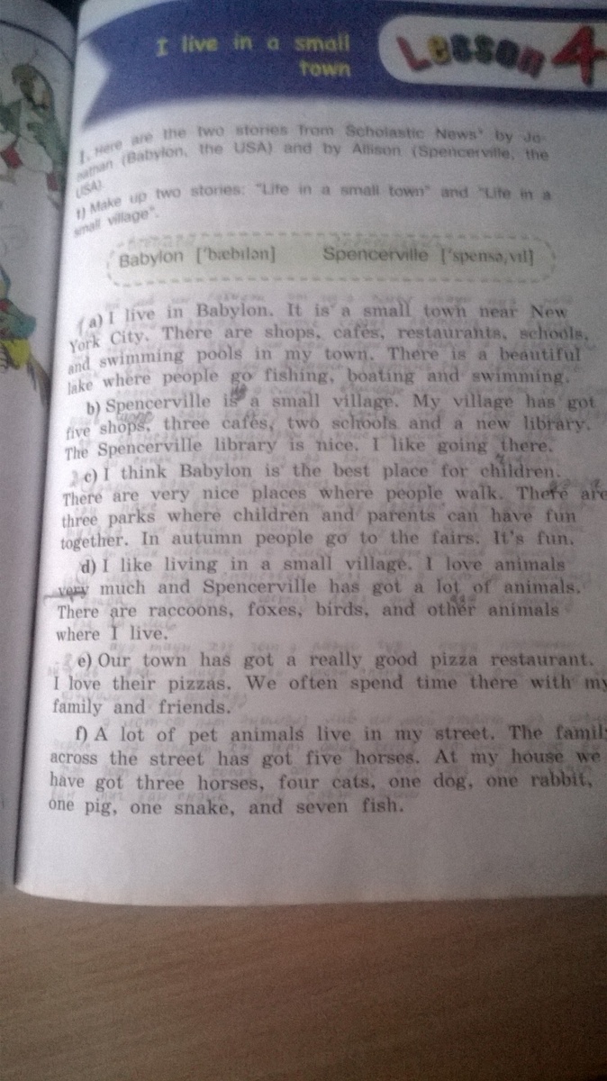 b) Спенсервилль - это маленькая деревня. В моей деревне 5 магазиной, 3 кафе, 2 школы и новая библиотека. Библиотека Спенсервилля милая. Я люблю ходить туда.