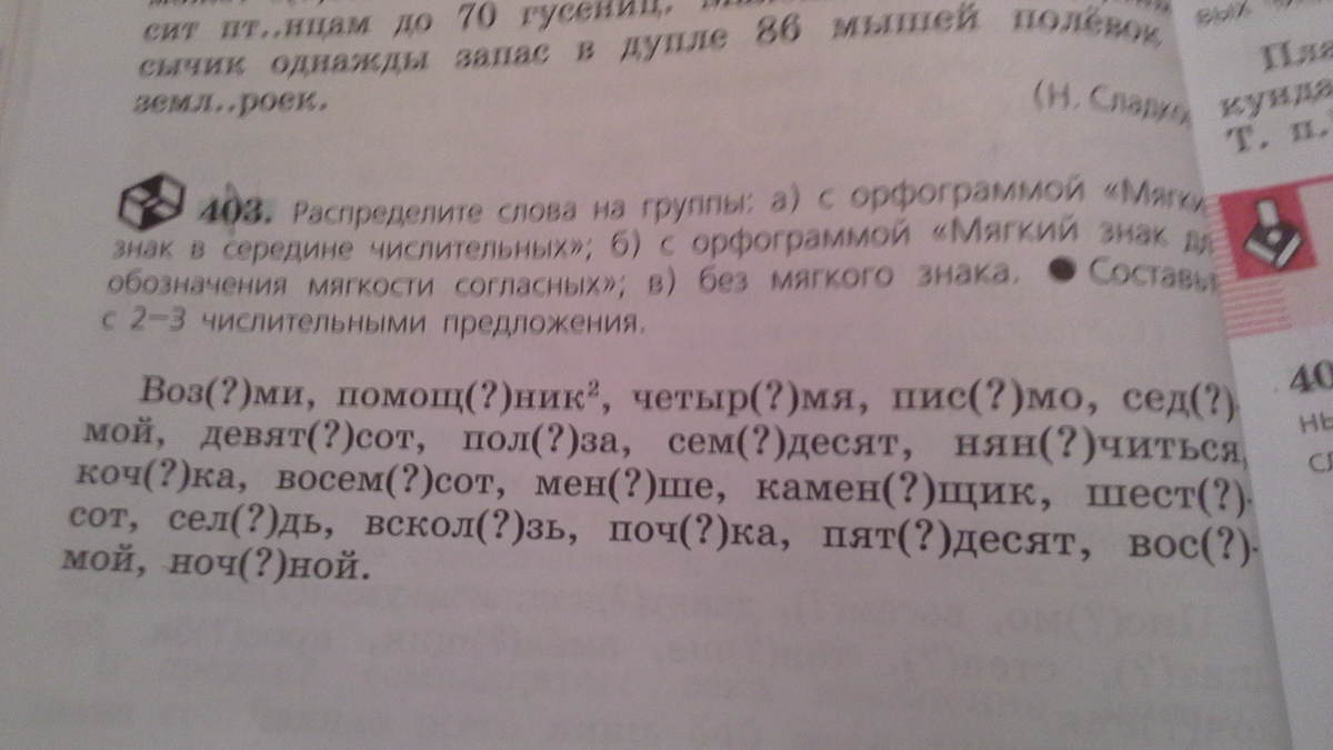 возЬми, помоЩник, четырЬмя, писЬмо, седЬмой, девятЬсот, полЬза, семЬдесят, няНчиться, коЧка, восемЬсот, менЬше, камеНщик, шестЬсот, селЬдь, всколЬзь, поЧка, пятЬдесят, восЬмой, ночЬной.