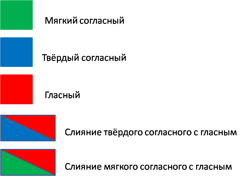 Таким образом, у обоих слов звуковая схема, т.е. модель слова, будет абсолютно одинакова. Выглядеть она будет в виде трёх прямоугольников, каждый из которых разделён по диагонали на сине-красный цвет.