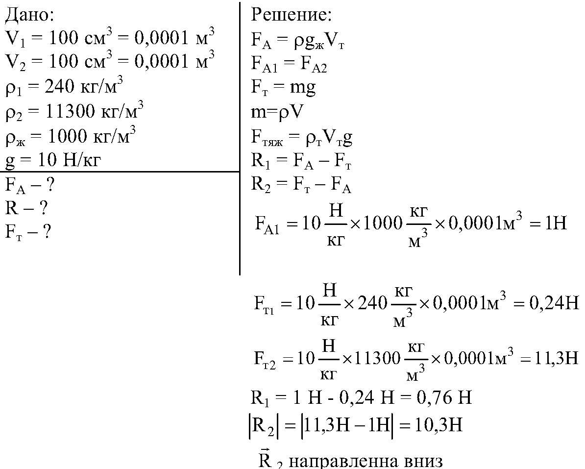 задача за 7 класс Чему равна архимедова сила действующая в воде на тела объемом100см3сделанные одной из пробкир другой из свинца?Чемудля каждогоиз этих телравна равнодействующая двух сил Fm и Fa?Как она направлена?
