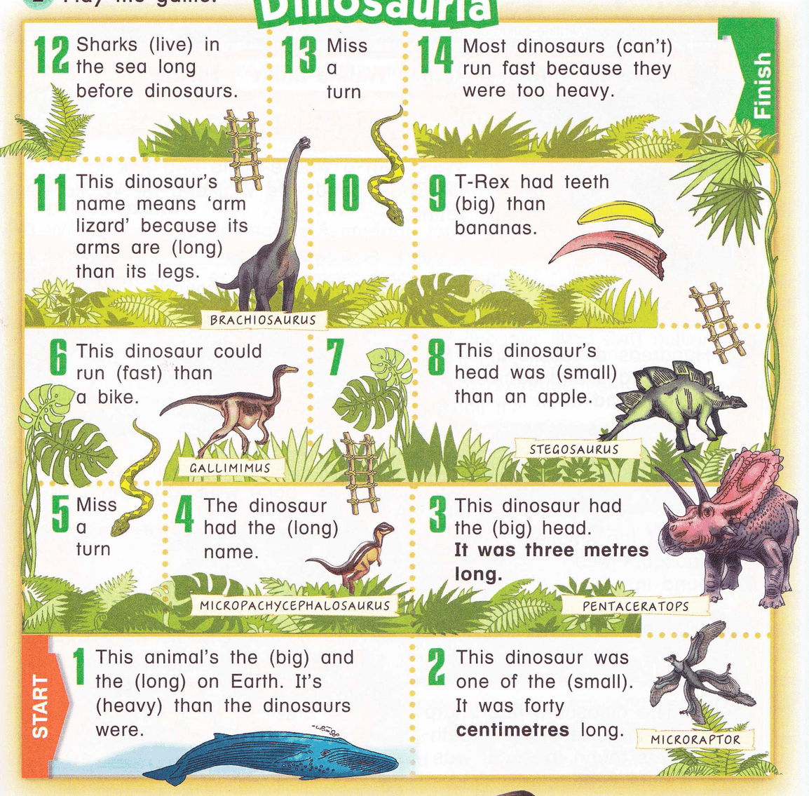 11.Название этого динозавра означает "рука ящерицы", потому что его руки (длиннее), чем его ноги. 9. T-Rex были зубы (больше), чем бананы.6. этот динозавр мог бежать (быстрее), чем велосипед. 8 голова этого динозавра был (меньше), чем яблоко. 5 пропустите поворот. 4. динозавр имел (длинное) имя. 3 этого динозавра был большой (голова). Это было задолго три метра. 1. это животное (большое) и (длинное) на Земле. Он(тяжелей), чем динозавры. 2 этот динозавр был одним из (маленьких). это было давно сорок сантиметров.