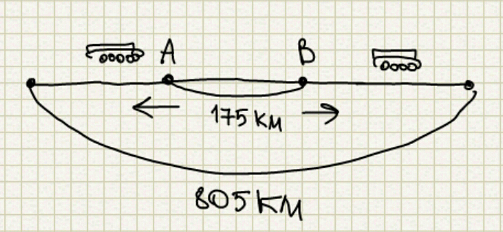Из городов А и В находящихся на расстоянии 175 км друг от друга вышли одновременно в противоположны8 направлениях два поезда один из них шёл со средней скоростью 50км в час другой 55 км в час на каком расстоянии друг от друга будут эти поезда через 6 часов после начала движения