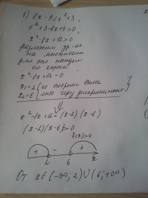решите неравенство методом интервала 1) 8x-9<x^2+3
