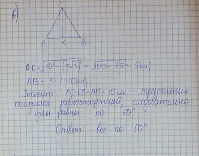 боковая сторона равнобедренного треугольника равна 10 см, а высота, проведенная к основанию, равна 5 корень из 3. Найдите углы треугольника.
