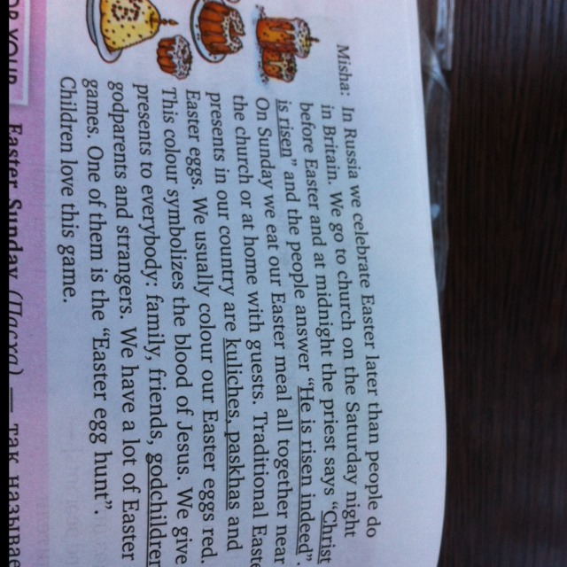 В россии мы отмечаем пасху позже чем в Великобритании. Мы идем в церковь в субботу ночью перед самой пасхой и в полночь священник говорит ХРИСТОС ВОСКРЕС а люди ему отвечают ВОИСТИНУ ВОСКРЕС. В воскресенье мы кушаем наши пасхальные блюда все вместе у церкви или дома с гостями. Традиционные пасхальные подарки в нашей стране это куличи, пасхи и яйца. Мы обычно раскрашиваем яйца в красный цвет. Это символизирует кровь Иисуса. Мы дарим подарки всем: родственникам, друзьям, крестникам, крестным родителям и незнакомцам. У нас много пасхальных игр. Одна из них это НАЙДИ ПАСХАЛЬНОЕ ЯЙЦО. Дети очень любят в нее играть.