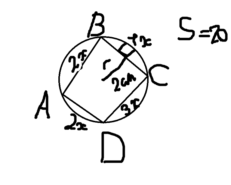 Четырёхугольник ABCD описан около окружности радиусом r=2 см. Известно, что AB:CD=2:3. AD:BC=2:1. Найдите стороны четырёхугольника , если его площадь S=20 см ?