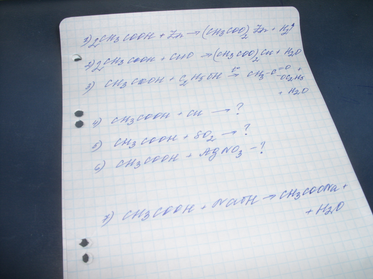 Пожалуйста напишите уравнения возможных реакций для Уксусной кислоты 1)CuO, 2)Zn, 3)C2H5OH, 4)SO2, 5)AgNO3, 6)Cu, 7)NaOH.