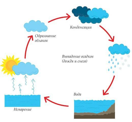 Под действием солнечного тепла вода в Мировом океане нагревается превращается в пар и поднимается в воздух.Там влажные воздушные массы поднимаются вверх,где на высоте становятся холодными.Образуется конденсат.Так формируются облака,которые под действием ветра переносятся на материки,где и выпадают в виде осадков.