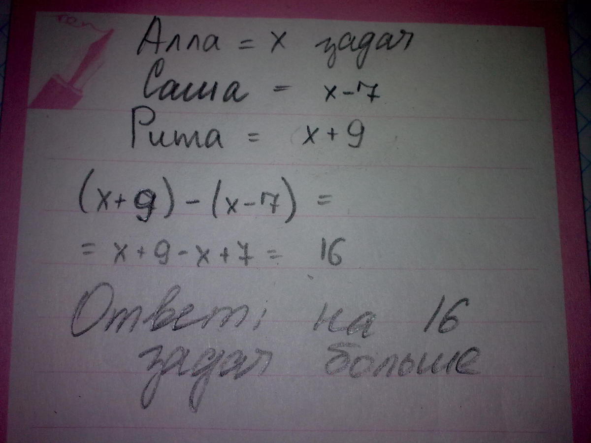 Алла решила на 7 задач больше ,чем Саша,а Рита- на 9 задач больше ,чем Алла.На сколько больше задач решила Рита ,чем Саша?